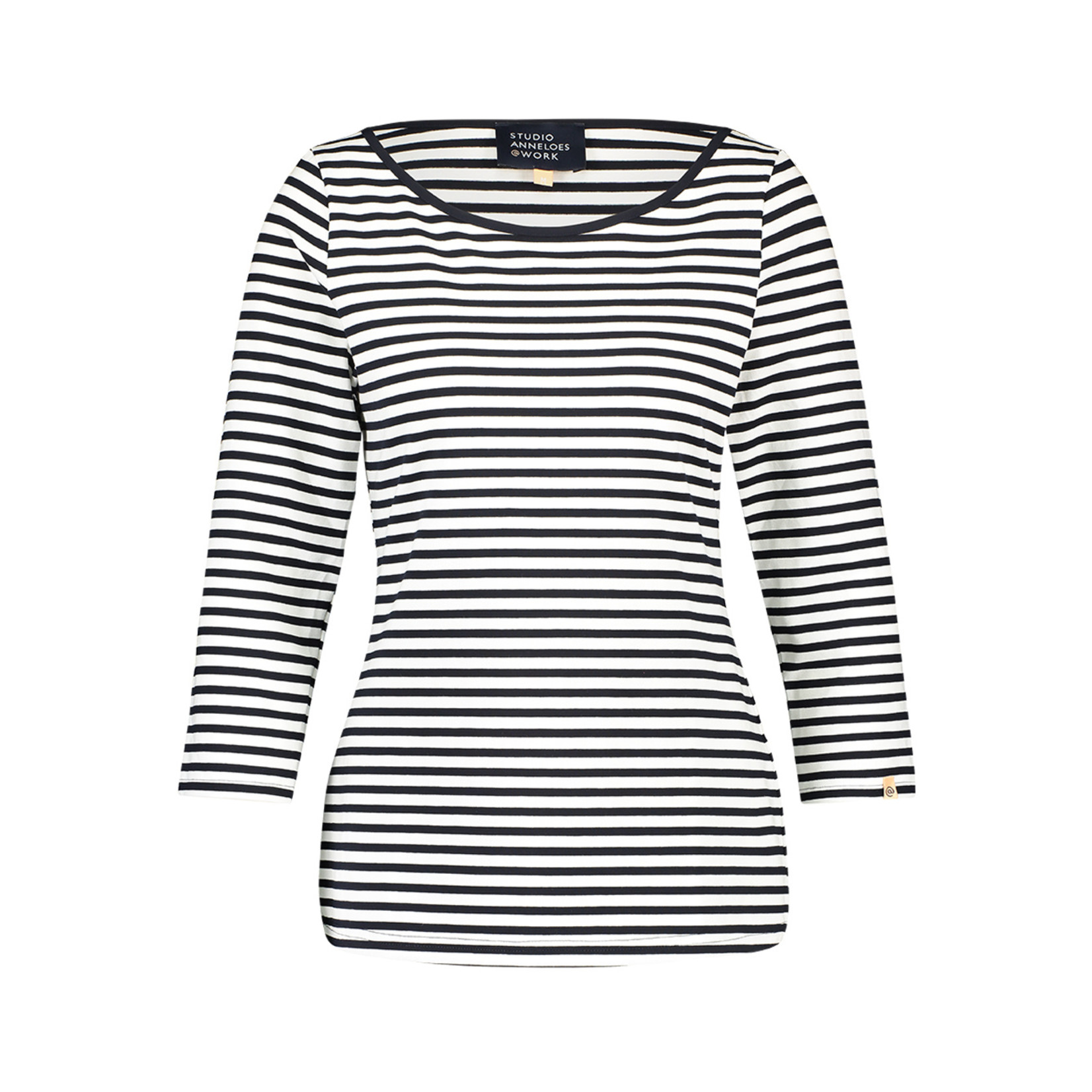 The Den Bosch stripe company T-shirt from Studio Anneloes is made of viscose and is available in the stripe colors white/dark blue or white/black.