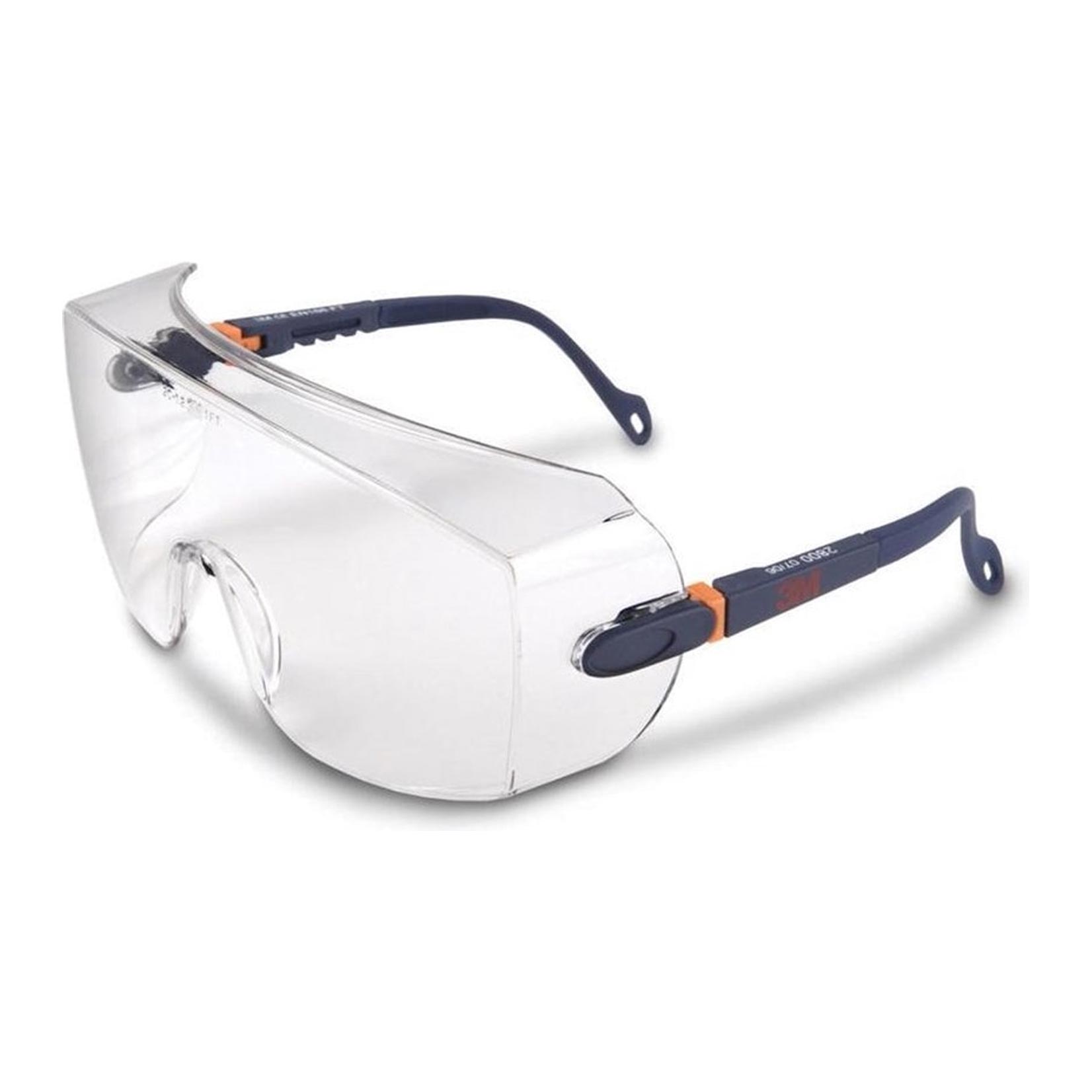 The 3M™ Safety Goggles 2800 Series can be worn over prescription glasses. They are also equipped with a tilting lens and four low profile spring lengths. The strong polycarbonate lens has a scratch-resistant coating. Weight: 38 grams.