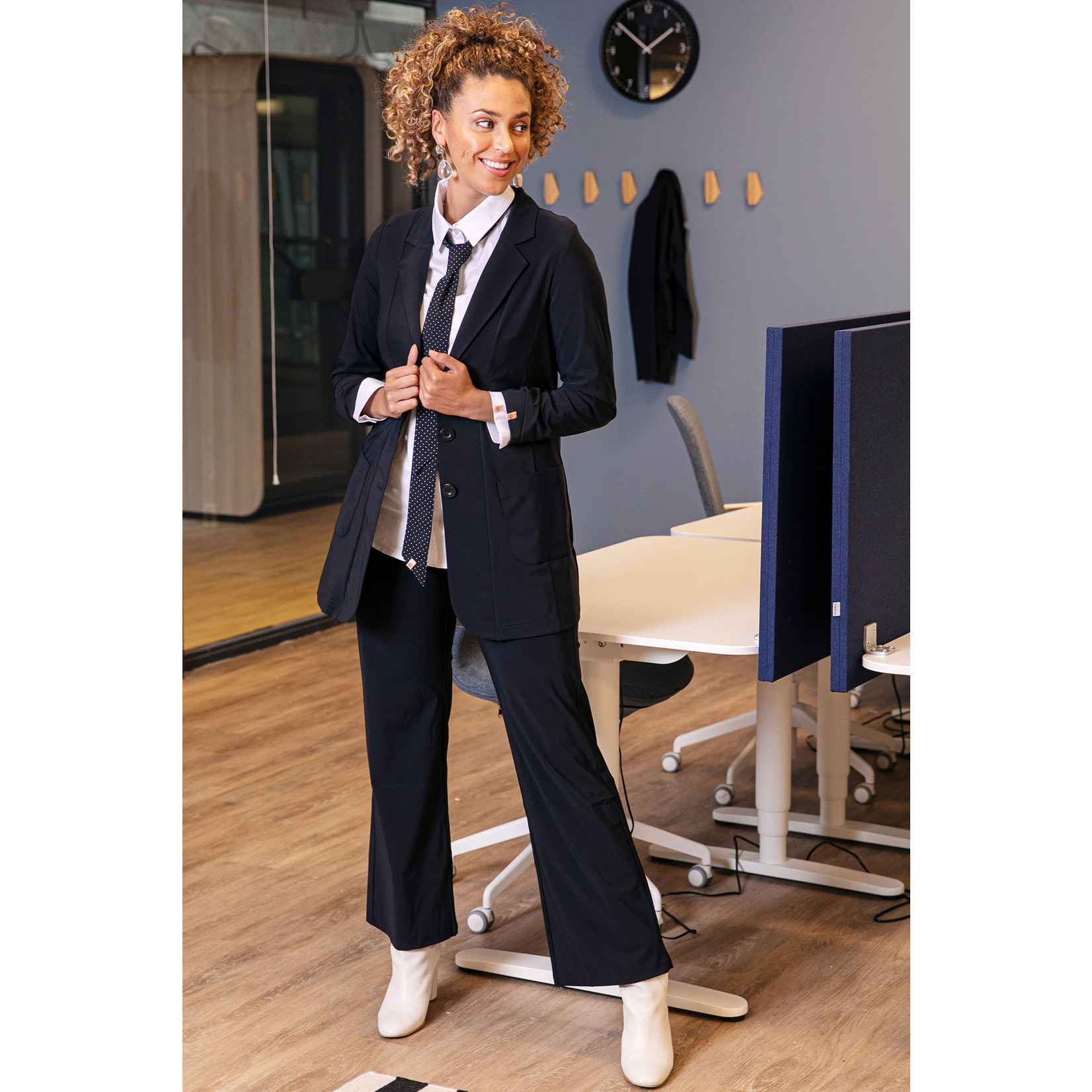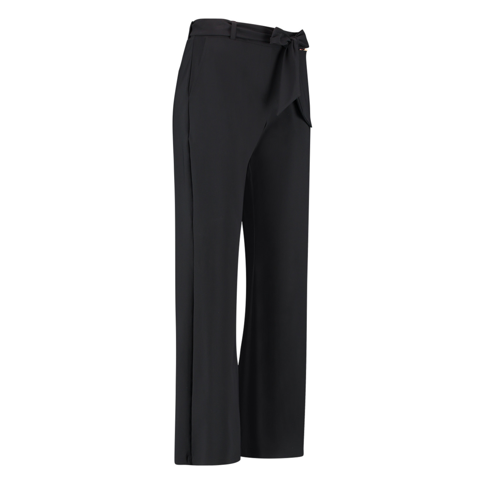 The Middelburg trousers by Studio Anneloes. The long trouser legs fit around the thigh and run straight from there, so that they are wide at the bottom. The wide straight trouser leg makes this model very flattering and feminine. The pants have side pockets at the front, fake welt pockets at the back and close with a belt at the waist with a comfortable elastic band.
